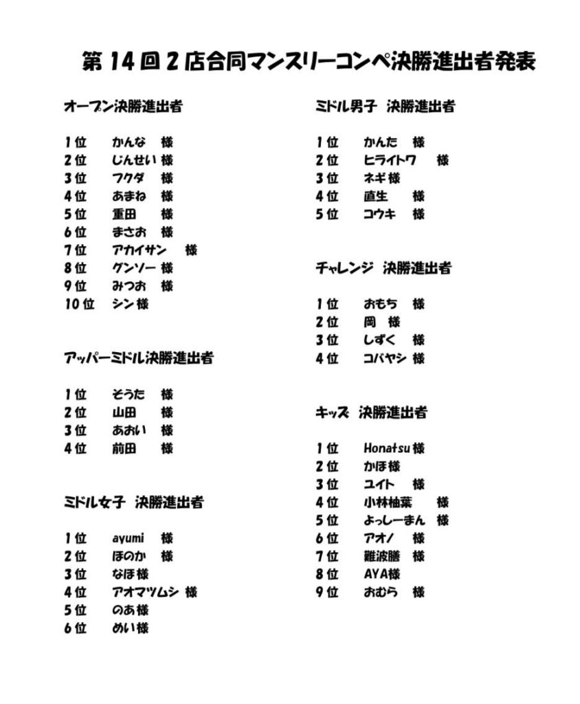 「第14回 2店合同マンスリーコンペ」は10月26日で予選が終了し、決勝進出者が決定しましたので発表します。予選には55名と多くの会員の皆さまに参加いただきました。参加いただいた皆さま、盛り上げていただきありがとうございました!